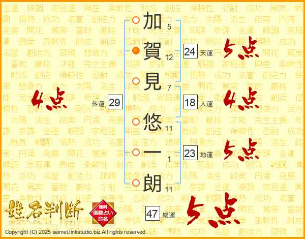 加(5画)賀(12画)見(7画) 悠(11画)一(1画)朗(11画)