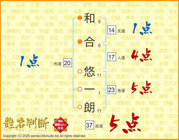 和(8画)合(6画) 悠(11画)一(1画)朗(11画)