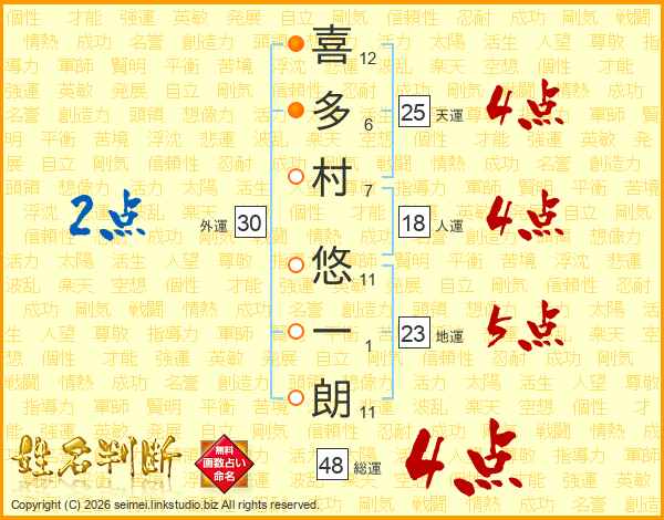 喜(12画)多(6画)村(7画) 悠(11画)一(1画)朗(11画)