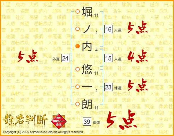 堀(11画)ノ(1画)内(4画) 悠(11画)一(1画)朗(11画)