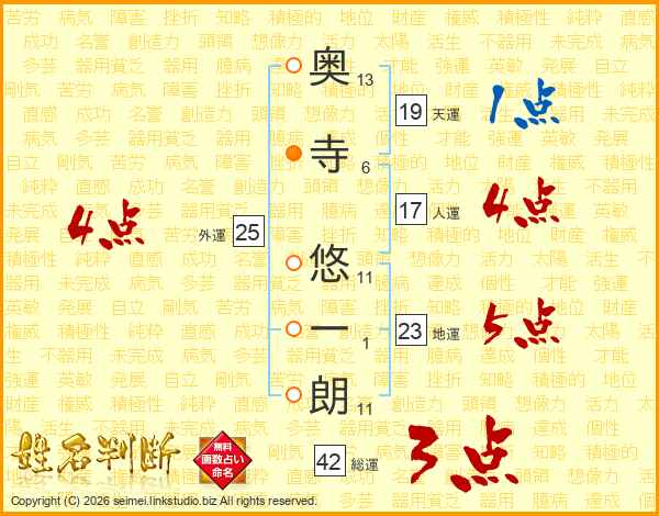 奥(13画)寺(6画) 悠(11画)一(1画)朗(11画)