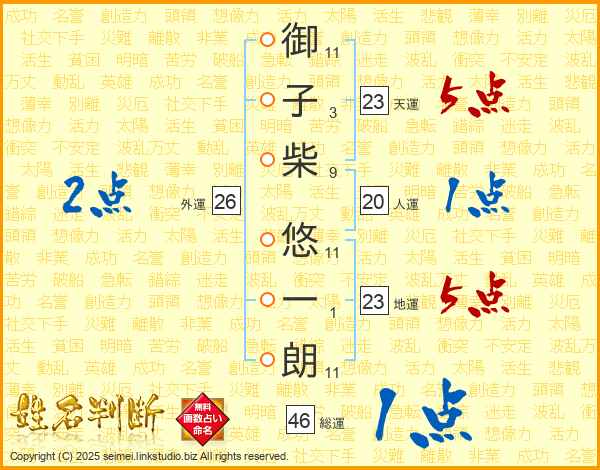 御(11画)子(3画)柴(9画) 悠(11画)一(1画)朗(11画)