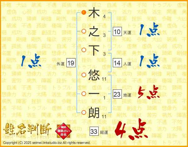 木(4画)之(3画)下(3画) 悠(11画)一(1画)朗(11画)