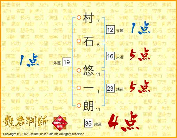 村(7画)石(5画) 悠(11画)一(1画)朗(11画)