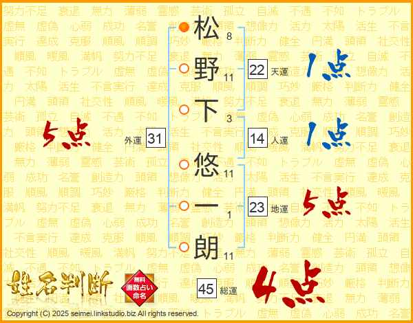 松(8画)野(11画)下(3画) 悠(11画)一(1画)朗(11画)