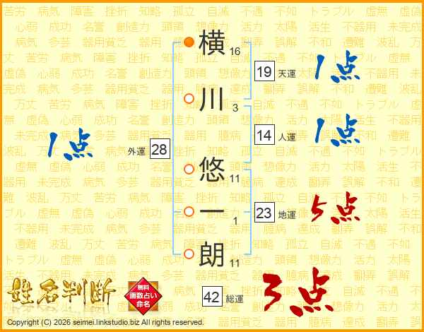 横(16画)川(3画) 悠(11画)一(1画)朗(11画)