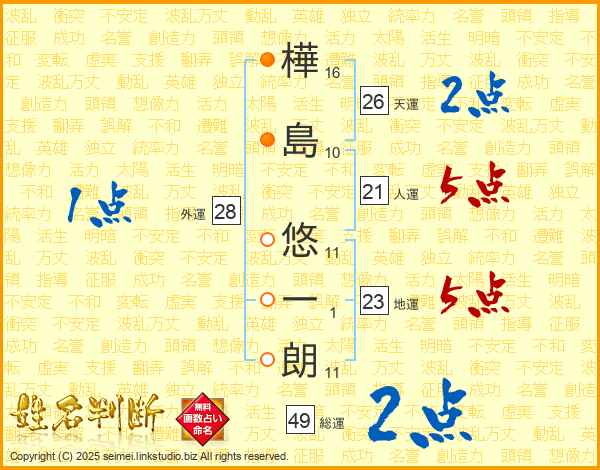 樺(16画)島(10画) 悠(11画)一(1画)朗(11画)