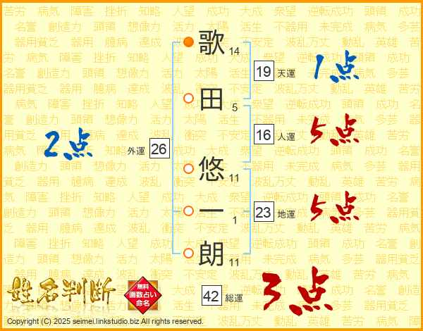 歌(14画)田(5画) 悠(11画)一(1画)朗(11画)