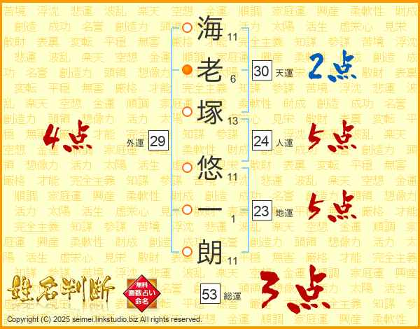 海(11画)老(6画)塚(13画) 悠(11画)一(1画)朗(11画)