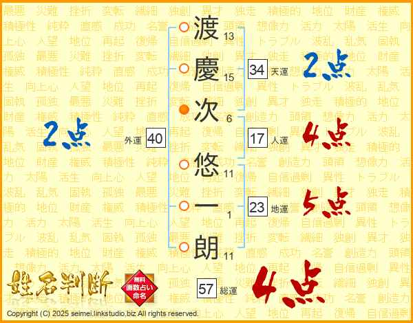 渡(13画)慶(15画)次(6画) 悠(11画)一(1画)朗(11画)