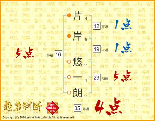 片(4画)岸(8画) 悠(11画)一(1画)朗(11画)