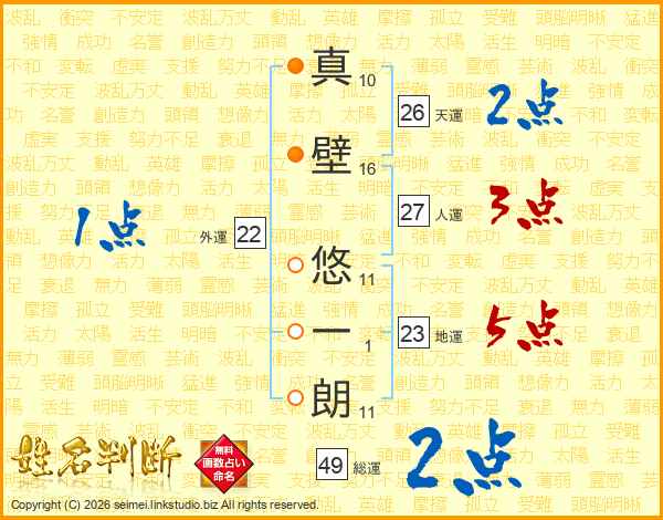 真(10画)壁(16画) 悠(11画)一(1画)朗(11画)