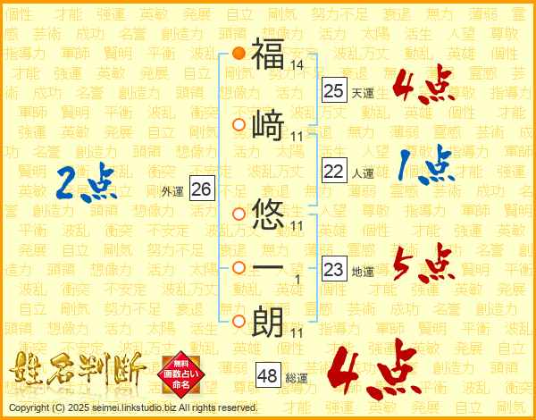 福(14画)﨑(11画) 悠(11画)一(1画)朗(11画)