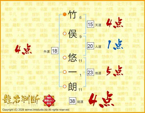 竹俣悠一朗さんの総運は38画の4点!