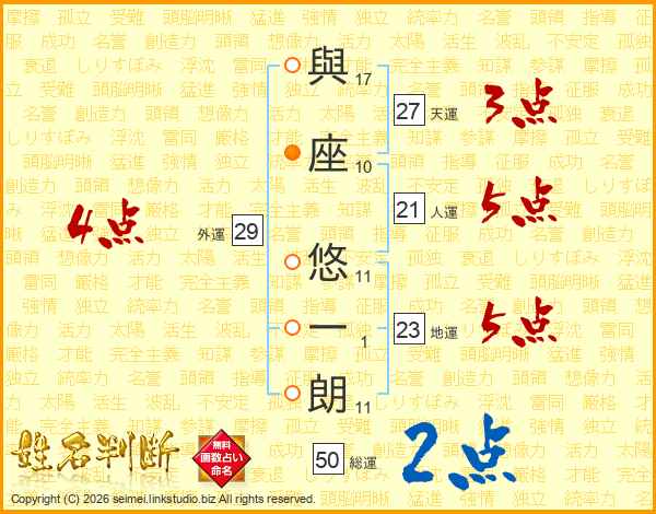 與(17画)座(10画) 悠(11画)一(1画)朗(11画)