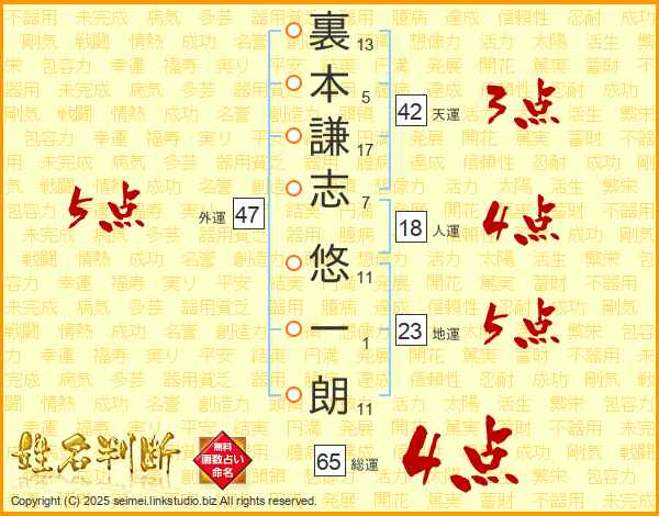 裏(13画)本(5画)謙(17画)志(7画) 悠(11画)一(1画)朗(11画)