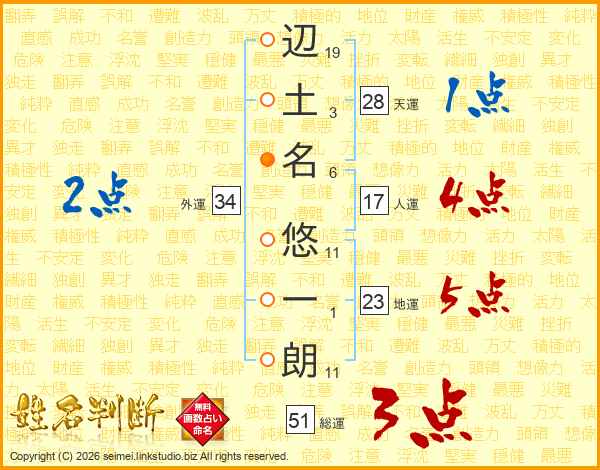 辺(19画)土(3画)名(6画) 悠(11画)一(1画)朗(11画)