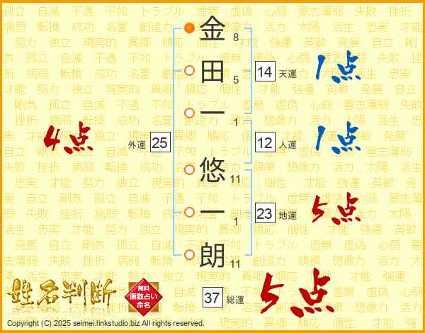 金(8画)田(5画)一(1画) 悠(11画)一(1画)朗(11画)
