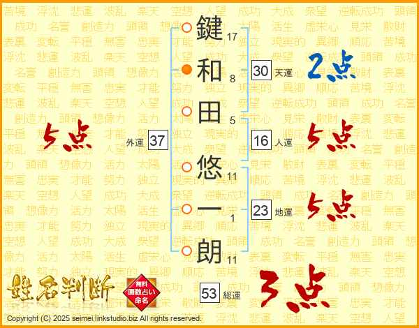 鍵(17画)和(8画)田(5画) 悠(11画)一(1画)朗(11画)