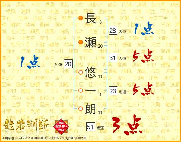 長(8画)瀬(20画) 悠(11画)一(1画)朗(11画)