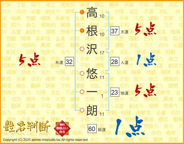 高(10画)根(10画)沢(17画) 悠(11画)一(1画)朗(11画)