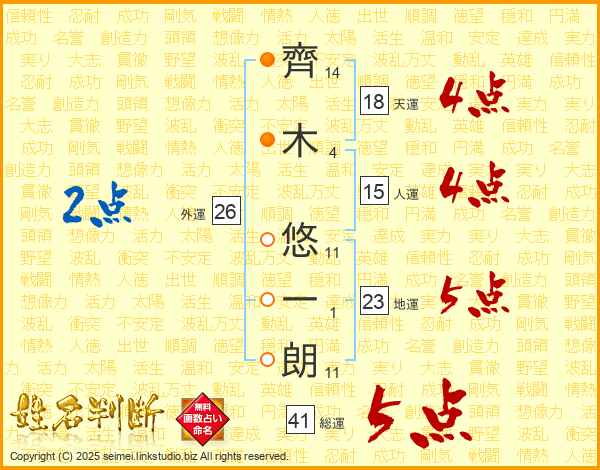 齊(14画)木(4画) 悠(11画)一(1画)朗(11画)