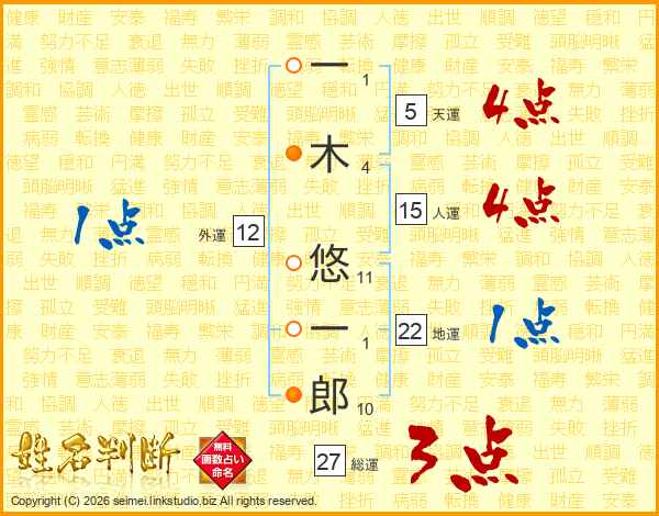 一(1画)木(4画) 悠(11画)一(1画)郎(10画)