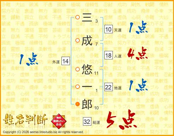 三(3画)成(7画) 悠(11画)一(1画)郎(10画)