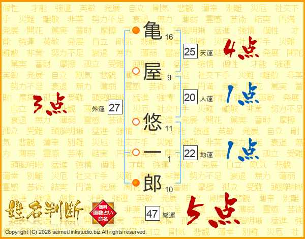 亀(16画)屋(9画) 悠(11画)一(1画)郎(10画)