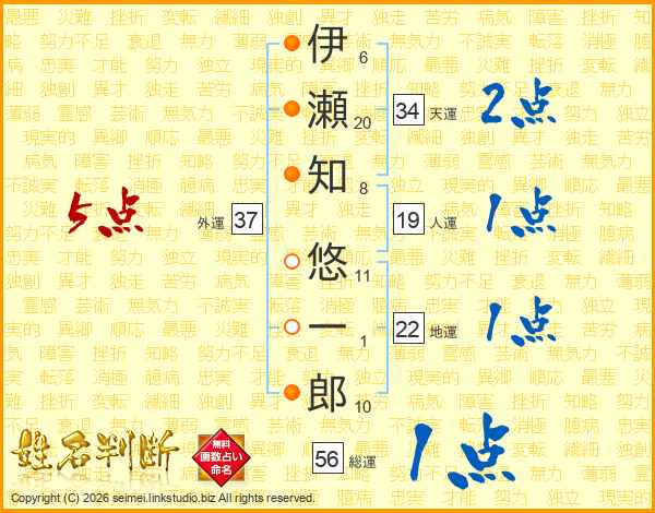 伊(6画)瀬(20画)知(8画) 悠(11画)一(1画)郎(10画)