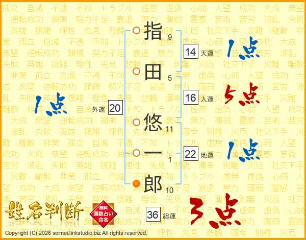 指(9画)田(5画) 悠(11画)一(1画)郎(10画)