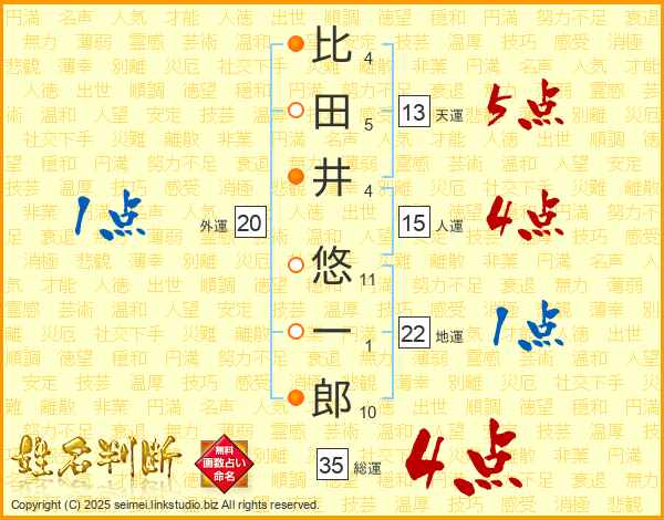比(4画)田(5画)井(4画) 悠(11画)一(1画)郎(10画)