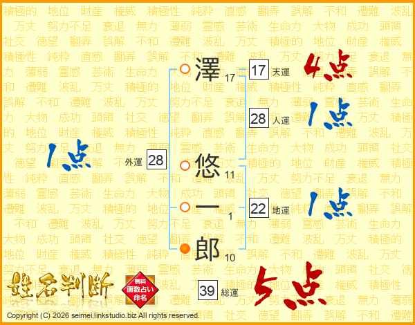 澤(17画) 悠(11画)一(1画)郎(10画)