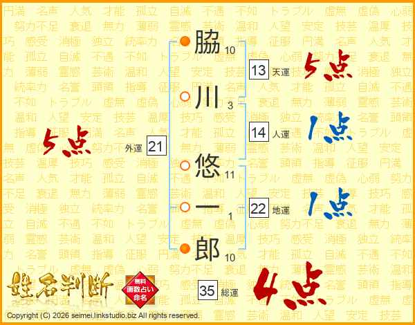 脇(10画)川(3画) 悠(11画)一(1画)郎(10画)
