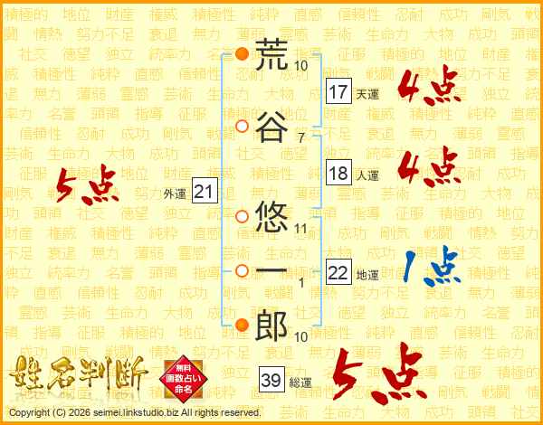 荒谷悠一郎さんの総運は39画の5点!