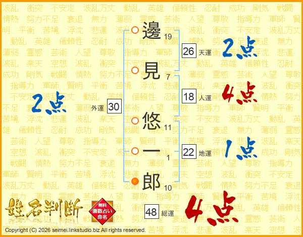 邊(19画)見(7画) 悠(11画)一(1画)郎(10画)