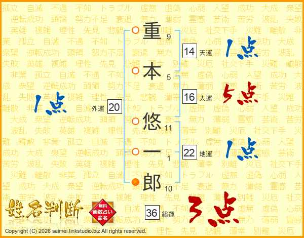 重(9画)本(5画) 悠(11画)一(1画)郎(10画)