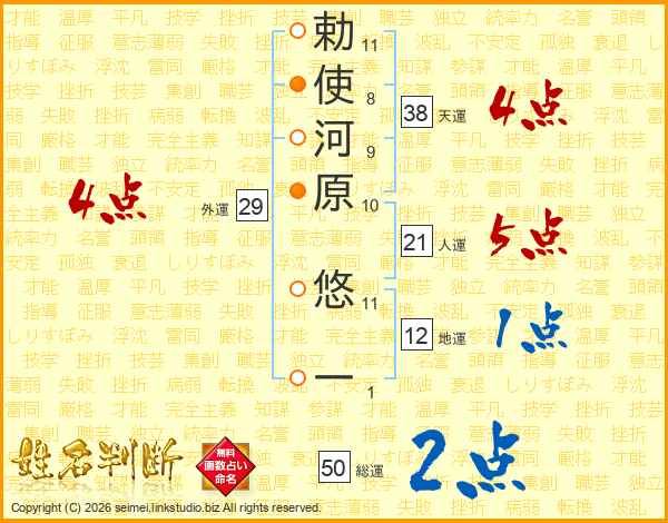 勅(11画)使(8画)河(9画)原(10画) 悠(11画)一(1画)