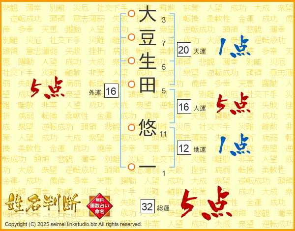 大(3画)豆(7画)生(5画)田(5画) 悠(11画)一(1画)