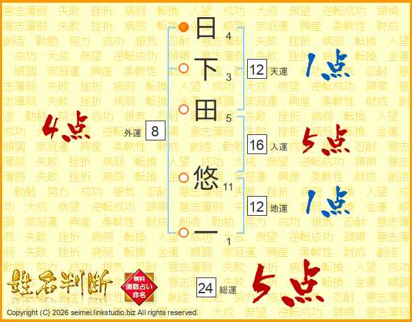 日(4画)下(3画)田(5画) 悠(11画)一(1画)