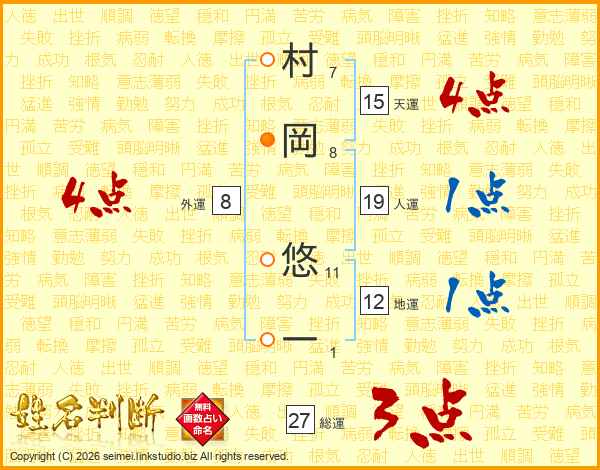 村(7画)岡(8画) 悠(11画)一(1画)