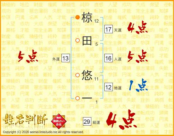 椋田悠一さんの総運は29画の4点!
