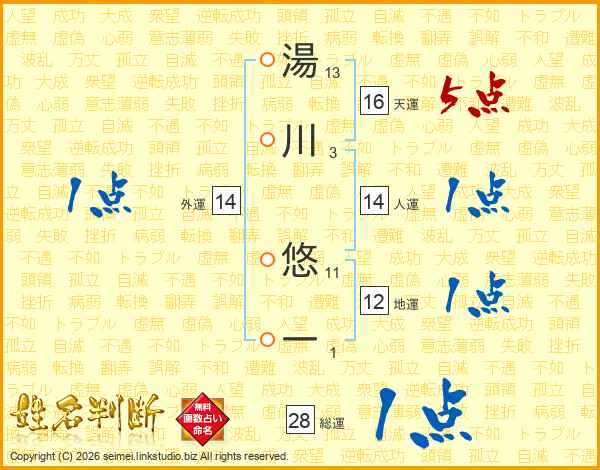生活面を象徴する運勢です。外部から受ける影響力を表し、結婚運、家庭運や職場、環境への順応性を表します。総運から人運を引いた画数。姓や名が1文字の場合を除く。