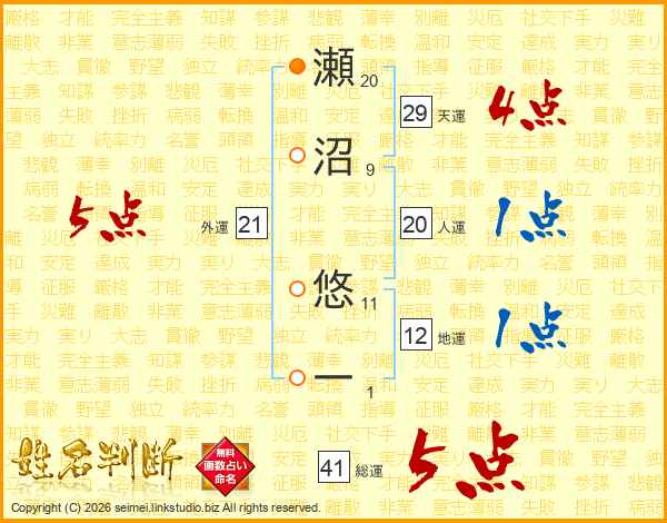 瀬沼悠一さんの総運は41画の5点!