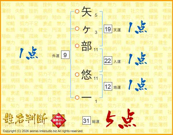 矢ヶ部悠一さんの総運は31画の5点!