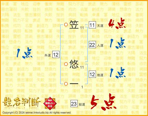 笠悠一さんの総運は23画の5点!