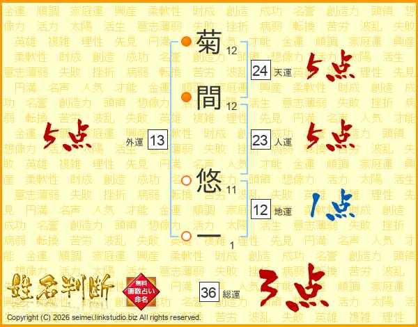 菊(12画)間(12画) 悠(11画)一(1画)
