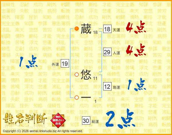 あなたの人生を表す1番重要な運勢です。生涯を通じて影響する総合運となり、主に50歳以降の晩年期に影響を及ぼします。苗字と名前の合計画数。