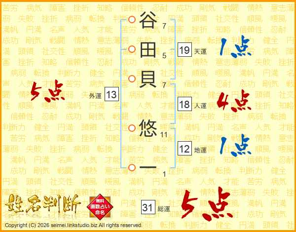 谷田貝悠一さんの総運は31画の5点!