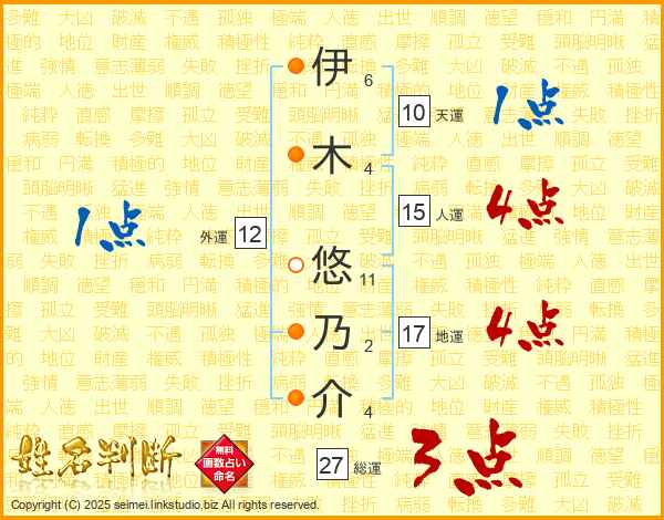 伊(6画)木(4画) 悠(11画)乃(2画)介(4画)